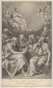 The doctors of the church consulting books and documents and contemplating the Virgin who is shown above in heaven, flanked by angels, after Reni