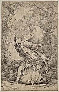 Rosa developed a radical vision of landscape that stood in deliberate opposition to the serene, pastoral compositions of his contemporary Claude Lorrain. Where Claude bathed his classical vistas in golden light, Rosa populated his scenes with wild, storm-battered terrain, rocky outcroppings, and bandits lurking in shadow. His canvases convey what later critics would call the Sublime — nature as something vast, threatening, and awe-inspiring rather than comforting. His major works include the brooding Democritus in Meditation (1650–51), the dramatic Saul and the Witch of Endor (1668), and his series of self-portraits that project an image of the artist as melancholic philosopher. He was equally accomplished as a printmaker and satirical poet.