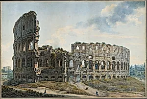 Settling in Rome from 1777 to 1793, Ducros became a leading vedutista, specializing in large-scale watercolors of ancient ruins, topographical landscapes, and dramatic seascapes that catered to Grand Tour patrons. He collaborated closely with engraver Giovanni Volpato on series like the 24 hand-colored "Views of Rome and the Surrounding Countryside" (1780s), including "Ruins of the Basilica of Maxentius" (c. 1779) and interiors of the Museo Pio-Clementino (published 1792). In 1778, he produced nearly 300 watercolors during a voyage to Sicily, Naples, and Malta for Dutch patrons, now in Amsterdam's Rijksmuseum. Standout works include "The Colosseum, Rome" (Metropolitan Museum of Art), "Pius VI Visiting the Pontine Marshes" (1783), "The Arch of Constantine, Rome," and "Night Storm at Cefalù" (c. 1800–1805), blending Claude Lorrain's luminous foliage with Piranesi's monumental scale and pre-Romantic sublime effects like storms and eruptions, enhanced by gouache and gum for oil-like durability.