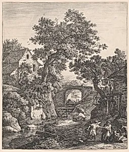 Waterloo's career blended painting, etching, and drawing, though oil paintings are scarce; he sustained himself primarily as an art dealer, trading works by contemporaries like Jacob van Ruisdael, Simon de Vlieger, Roelant Roghman, and Allaert van Everdingen, whose styles he absorbed into his own Baroque landscapes. His output emphasized dense forest scenes, winding paths, reflective waters, and atmospheric mountain valleys, often rendered with intricate detail in etchings or impressionistic breadth in drawings. Extensive travels along the Rhine to German towns like Kleef and Hamburg, and possibly to Switzerland, France, Poland, and Italy, informed his topographic precision and naturalism. He produced around 126 etchings, including series such as *Twelve Landscapes*, *Six Landscapes*, and *Six Large Upright Landscapes with Scenes from Ovid*, alongside notable plates like *Traveler Near a Wood* (c. 1645) and *Landscape with Venus and Adonis* (c. 1655–1660). Paintings like *Forest Edge* and *Tobias and the Angel* highlight his rarer canvases.