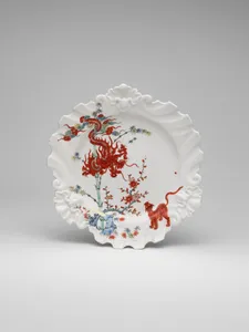 Working in the Rococo tradition, Chelsea excelled in translucent, glass-like bodies with lustrous lead glazes, drawing from Meissen for early figures and birds, Japanese Kakiemon patterns, and later Sèvres for vibrant grounds like mazarin blue and turquoise. Principal modeler Joseph Willems, a Flemish sculptor active from 1749 to 1766, crafted intricate figures on scroll bases with bocage screens, while painters like Jefferyes Hamett O'Neale decorated fable scenes and Louis-François Roubiliac contributed models such as Hogarth's pug dog *Trump* (1747–50). Signature outputs included whimsical "Chelsea toys"—miniature étuis, thimbles, and scent bottles—alongside tureens shaped as rabbits, crayfish, or plaice (c. 1755), botanical services inspired by Chelsea Physic Garden, and elaborate tablewares like the Mecklenburg service (1763) commissioned for George III.