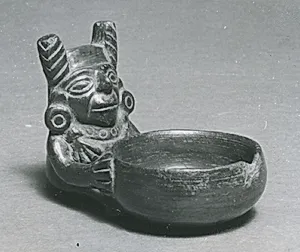 Chimú art epitomized the culture's mastery of form and material, defined by a distinctive monochromatic blackware pottery achieved through oxygen-reduced high-temperature firing, yielding lustrous, mold-made vessels often modeled as creatures, humans, or everyday scenes like fishermen in reed boats (ca. 1100–1400 CE, Museum of the Americas, Madrid) or vases with chili peppers (Musée des Amériques). Metalworkers excelled in tumbaga (gold-copper alloy), employing lost-wax casting, hammering, and depletion gilding for ornate earspools depicting shell divers, hammered silver beakers with faces (ca. 1100–1536 CE, Yale University Art Gallery), and ritual regalia. Textiles featured intricate tapestry weaves and featherwork in camelid fibers and cotton, while spondylus shell collars—crafted from Ecuadorian "thorny oysters" symbolizing fertility and the sea—adorned elites, as seen in a 12th–14th century example at the Metropolitan Museum of Art. Architectural reliefs at Chan Chan, such as the "Los Buceadores" (divers harvesting shells), captured marine motifs in high-relief adobe.