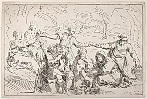 The martyrdom of Saint Angelo who in the upper left is being stabbed watched by horrified onlookers, from the 'Cabinet Crozat'