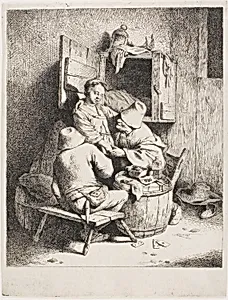 Zittende man met hoed in hand, kruik op de grond