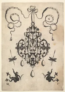 Among his major works are expansive series published in Augsburg, including a 1593 suite of eight plates depicting the Seven Virtues (such as *Fides*, *Iustitia*, and *Fortitudo*) with enamel motifs; a 1595 set of strapwork pendants; and profuse 1596 engravings like *Title Page: Large Pendant with Venus and Amor*, *Brooch with Winged Fauns Blowing Trumpets*, *Large Pendant with Flora Holding a Fruit Garland*, and *Brooch with Dragons and Winged Monsters*. Later pieces, dated 1616, feature sirens, dragonflies, and elaborate niello patterns across sets of 14 to 18 plates.