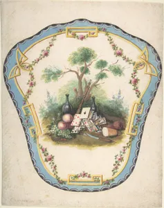 Design for a Firescreen with Picnic Scene and Playing Cards