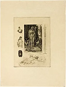 Rops's oeuvre spanned caricature, realism, and Symbolism, aligning him with Decadence and the Parisian fin de siècle. A founding member of the Société Libre des Beaux-Arts (1868) and Les XX (1883–1893), he championed progressive art through vivid intaglio prints, aquatints, and illustrations. Influenced by Honoré Daumier, Gustave Courbet, and Charles Baudelaire—whom he met in 1864 and illustrated for *Les Épaves* (1866)—Rops infused his work with eroticism, Satanism, social satire, and occult themes, often shocking contemporaries. Married to Charlotte Polet de Faveaux in 1857 (with whom he had son Paul and daughter Juliet, who died young), he estranged by 1875, settling in Paris with sisters Aurélie and Léontine Duluc, fathering daughter Claire with the latter. Major works include the provocative *Pornocrates* (1878), a Symbolist watercolor mocking lechery's triumph; *Les Sataniques* (1882), a series evoking biblical parables with demonic flair; and etchings for Barbey d'Aurevilly's *Les Diaboliques* (1880s), such as *Le Plus Bel Amour de Don Juan*. He pioneered Belgian comics with strips like *Les Époux Van-Blague* (1853).