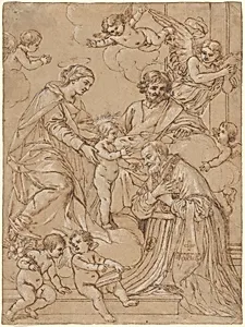 The Holy Family with Saint Philip Neri in Adoration, an Angel, and Putti