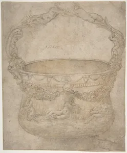 Design for a Bucket-Like Vessel with a Handle of Non-Figural Interlaces, on a Body Adorned with a River God and Two Putti