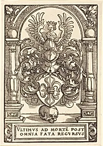 The Emperor Seated on His Throne, Seated Between Joanna of Castile and Mary of Burgundy, Above Are Twenty-two Winged Victories; with Coats of Arms of Maximilian's Noble Relatives, from the Arch of Honor, proof, dated 1515, printed 1517-18