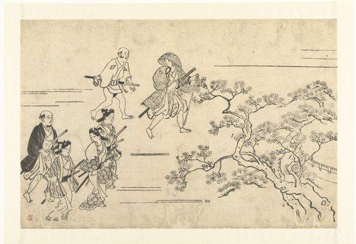 Hishikawa Moronobu was born in 1618 in Yasuda (also known as Hota), a small town in Awa Province (present-day Chiba Prefecture), located on the Bōsō Peninsula across Edo Bay from the growing capital city of Edo. His father, Hishikawa Kichizaemon, was a skilled textile dyer and embroiderer who specialized in nuihaku—a technique involving the application of gold and silver leaf to embroidered fabrics, commonly used for Noh theater costumes.