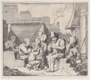 Nine peasants outside of a rustic house, with a seated man holding a pint and giving a glass to a woman in the foreground