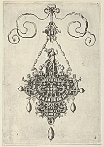 Design for the Verso of a Pear-Shaped Pendant Flanked by Lozenge Ornaments and Circular Ornaments Below