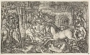 Jean Duvet (1485–after 1562), a pioneering French goldsmith and engraver from the provincial heartlands of Dijon and Langres, emerged as the first significant printmaker in France. Born to a Dijon goldsmith, he trained in the family trade and rose swiftly, becoming master of the Dijon Goldsmiths' Guild by 1509. Duvet's early career blended goldsmithing with engraving; no specific teachers are documented, but his technique drew from copying Italian masters like Marcantonio Raimondi and Andrea Mantegna, suggesting exposure to their prints and possibly a trip to Italy around 1519. Appointed goldsmith to Francis I in 1521 during a royal visit to Langres—where he orchestrated festive decorations—and later serving Henry II, he remained rooted in these regional centers, far from the court's Fontainebleau sophistication.