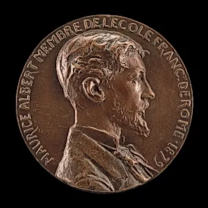 A pioneer of Art Nouveau medallic art, Roty revolutionized the medium by abandoning traditional rims—as in his 1867 Naudet medal—and embracing the Renaissance plaquette form, blending graceful figures, landscapes, and integrated backgrounds into sculptural reliefs. He designed over 140 medals, including the iconic *La Semeuse* (The Sower) in 1886–1897, commissioned for the Ministry of Finance and immortalized on French silver coins from 1897 and postage stamps from 1903; the 25th anniversary *Patria* for the Third Republic; the Lens Mining Company medal (1899); Louis Pasteur's 70th birthday; and the Madagascar expedition (1895). Other masterpieces feature portraits like Sir John Pope Hennessy and Pierre Boulanger (his father-in-law, married 1878), alongside public reliefs such as *La Peinture* and *La Musique* for Paris City Hall.