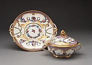 The factory pioneered techniques like slipcasting for intricate vases and the iconic bleu de Sèvres glaze from cobalt oxide, transitioning from soft-paste (perfected by Louis-François Gravant) to hard-paste after discovering kaolin at Saint-Yrieix-la-Perche in 1768, with commercial production by 1773. Stylistically, it embodied the exuberant Rococo of the 1760s—seen in floral "fleurisserie" and whimsical forms—evolving into austere Neoclassicism by the 1770s, with gilded borders, marine trophies, and genre scenes after David Teniers. Landmark works included the pot-pourri vase in the shape of a ship (Vase à vaisseau, 1764, modeled by Duplessis), of which ten survive; the Pot-Pourri Myrte (1762); vases for Louis XVI (1778–1782); and the lavish "Service à frise riche en couleurs et riche en or" for Marie Antoinette (1784).