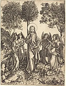Among his major works are *Mary Magdalen* (ca. 1490, Metropolitan Museum of Art), depicting the saint clutching an ointment jar atop a schematic mound; *Christ in the Wilderness Served by Angels* (ca. 1480–90, Metropolitan Museum of Art and National Gallery of Art); *Saint John the Evangelist* (ca. 1480/1490, National Gallery of Art); *Saint Elizabeth of Hungary* (late 15th century, Birmingham Museum of Art); and *The Baptism of Christ* (ca. 1480–1500, Clark Art Institute). These engravings, often in multiple states, showcase his technical prowess in rendering textures—from flowing hair to metallic halos—and his focus on popular saints, making sacred imagery accessible to a broader audience through affordable prints.