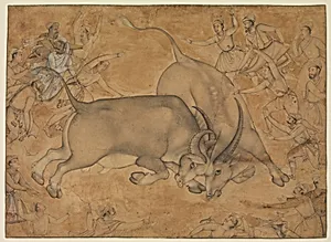 Working in the Mughal school tradition, Miskin excelled in naturalistic portrayals of animals and human figures, masterfully capturing dynamic motion, anatomical precision, and emotional intensity. His style synthesized Persian influences with indigenous Indian elements, evident in the thrusting musculature and lifelike energy of his subjects—traits that set him apart as Akbar's premier animal painter. He often sketched from life during court spectacles like animal combats, infusing his works with palpable drama and realism.