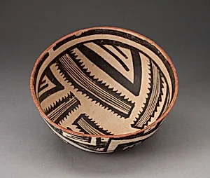 Bowl with Radiating Striped Bands and Triangles and Interlocking Zigzag on Exterior