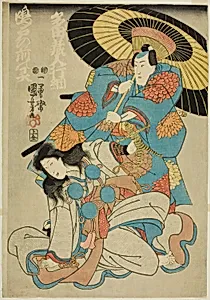 Utagawa Kuniyoshi (1797–1861) was born in Edo to the silk-dyer Yanagiya Kichiyemon, originally bearing the childhood name Yoshisaburō. From a young age, he assisted in his family's pattern design work, which sharpened his innate mastery of color and textile motifs that would permeate his later prints. At around twelve years old, his prodigious drawing skills drew the attention of the renowned Utagawa Toyokuni; Kuniyoshi entered Toyokuni's studio as a chief pupil in 1811, training rigorously until 1814, when he received his artist's name and began independent production.