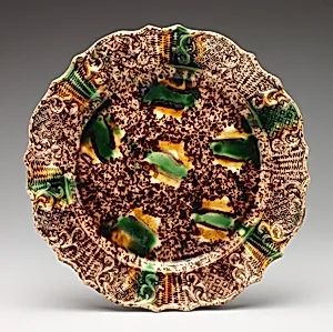 Operating within the robust Staffordshire pottery tradition, Whieldon type potters capitalized on local clays and kilns without documented formal training or specific mentors, though their styles closely echo those refined by master potter Thomas Whieldon at his Fenton Vivian factory. Exact attributions remain uncertain due to the lack of maker's marks and shared molds across workshops, leading to the generic "Whieldon type" label for this broad group of wares. Key examples include a circa 1750–65 agateware teapot (Metropolitan Museum of Art), a lead-glazed plate with molded fruit borders from around 1750–70, and lively figures such as seated dogs, parrots, cats, and a milkmaid with her cow, all enlivened by broad strokes of green, brown, and blue glazes. Rarer novelties, like manganese-glazed plum models on leaves circa 1775, highlight their playful realism.