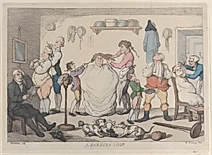 Step into the lively world of early 19th-century British satire with *A Barber's Shop (1811), a hand etching created by master caricaturist Thomas Rowlandson after design by Henry William Bun. This print captures a chaotic barber shop scene teeming with exaggerated male figures—likely poking fun at the pretensions, follies, and everyday absurdities of Regency gentlemen amid their grooming rituals. Measuring 10 1/16 × 13 7/8 inches, it's a gem from the Metropolitan Museum of Art's Elisha Whittelsey Collection. Rowlandson, a leading figure in London's printmaking scene during the Georgian era's...