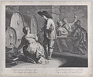 A barmaid filling mugs at left, a man holds a bottle at center, and three people sit at a table drinking at right