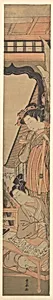 In the enchanting woodblock print *A Beauty Looking Down upon Young Man Reading a Love*, created around 1771 by Utagawa Toyaru, a graceful woman peers down from an upper balcony at a young man absorbed in a romantic missive below. This narrow "pillar print"—measuring just 4¼ inches wide—was designed for hanging on slender architectural pillars in Japanese homes or teahouses, showcasing Toyoharu's mastery of the ukiyo-e ("pictures of the floating world") tradition. Using ink and vibrant colors on paper, the artist captures intimate everyday moments with delicate lines and subtle shading, evokin...