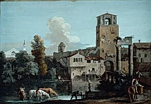 A Capriccio with Horses Watering in a River Outside a Walled Town
