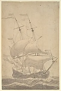 Willem van de Vel I, a master of Dutch marine art during the Golden Age, captured the raw power of the sea in *A Dutch Ship in a Breeze* (ca. 1665). Created amid the Netherlands' dominance as a maritime superpower—right before the Second Anglo-Dutch War—this drawing depicts a sturdy Dutch vessel battling fierce winds, emblematic of the era's naval prowess and seafaring spirit. Van de Velde I, father to fellow artist Willem II, earned fame for his precise "ship portraits," documenting vessels with documentary accuracy for both art and historical records. Rendered in brush and gray ink with gra...