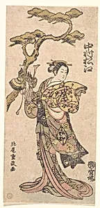 In the vibrant world of Edo-period Japan (1615–1868), Kitao Shigem's woodblock print *A Famous Actor of Women's* (ca. 1764) captures the allure of kabuki theater. This intimate print, measuring just 11⅛ × 5⅛ inches, depicts a celebrated *onnagata*—a actor renowned for portraying women with graceful poise. Surrounded by delicate trees, the figure embodies the theatrical glamour that captivated urban audiences in 18th-century Tokyo (then Edo). Shigemasa, a master of the ukiyo-e ("pictures of the floating world") style, elevated everyday celebrities like actors into icons of popular culture. Woo...