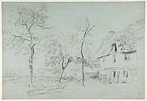 Constant Troyon (1810–1865), a leading figure in France's Barbizon school, captures the serene beauty of rural life in *A Farmhouse with ached Roof and Trees Beside River*. Created sometime between 1825 and1865, this drawing depicts a humble thatched farmhouse nestled among trees along a tranquil riverbank,oking the peaceful countryside of 19th-century France. Troyon's work reflects the Realist movement's shift away from idealized Romanticism toward honest portrayals of everyday landscapes, influenced by his travels to Holland and admiration for 17th-century Dutch masters like Jacob van Ruisda...