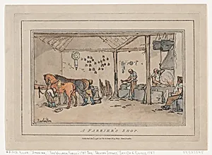 Step into the lively world of *A Farrier's Shop a hand-colored etching andatint created in 1798 by the collaborative talents of Valentine Green, Rupert Green and Thomas Rowlandson. Housed in Metropolitan Museum of Art's Drawings and Prints department, intimate print (sheet size: 7 13/16 × 10 11/16 in.) captures a slice of Georgian England, where farriers—skilled blacksmiths specializing in horseshoeing—plied their trade. The scene buzzes with men at work, horses in need of care, and hints of a bustling market atmosphere, reflecting the vital role of equine labor in 18th-century society. Rowla...