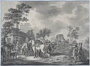 A Gathering of Horsemen and a Coach near a Watering Place