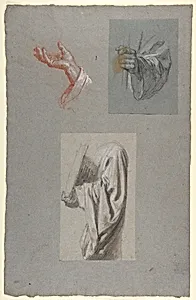 a. Hand of Saint Remi; b. Hand of Saint Remi; c. Drapery Study for Acolyte Holding Book (middle register); (studies for wall paintings in the Chapel of Saint Remi, Sainte-Clotilde, Paris, 1858)