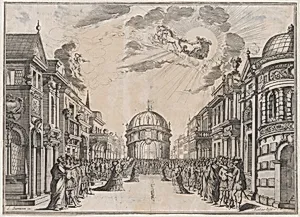 A large gathering of people in the street as a goddess races across the sky in a chariot led by four horses; set design from 'Il Fuoco Eterno'