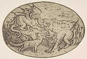 A lion, dragon and fox fighting each other, boats on the sea in the background, an oval composition