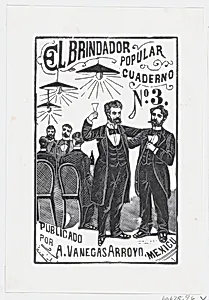 A man raising his glass with a group of men sitting at a table in the background, illustration for 'El Brindador Popular (The Popular Toastmaster)' published by Antonio Vanegas Arroyo