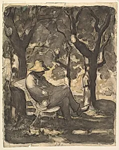 In Honoré Daumier's *A Man Reading in a Garden* (recto) with its preliminary sketch on the verso, created around 1865, we encounter a quiet moment of contemplation amid lush greenery. The French Realist artist, renowned for his sharp social caricatures and lithographic prowess, here captures an everyday bourgeois scene—a solitary man absorbed in reading. This double-sided sheet, measuring 13 5/16 x 10 5/8 inches, reflects Daumier's shift in later years toward intimate, humanistic studies, influenced by his failing eyesight and a deepening interest in ordinary life's poetry. The recto dazzles with layered techniques: watercolor over black chalk, enriched by pen and ink, brush and wash, and lithographic crayon for rich tonal depth and texture. The verso, in pen and brown ink with black-gray wash and crayon, reveals Daumier's preparatory process—fluid lines sketching the composition's essence. These mixed media highlight his mastery of drawing as both planning tool and finished work, bridging his satirical printmaking roots with painterly expression. Housed in the Metropolitan Museum of Art's H. O. Havemeyer Collection, this piece exemplifies 19th-century French draftsmanship's versatility, inviting viewers to savor the tranquility of reading in nature—a subtle counterpoint to Daumier's often biting social commentary.