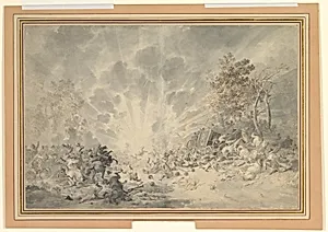 In the late 18th century, amid the turbulence of the French Revolutionary Wars, Dutch artist Dirk Langendijk captured raw drama of conflict in *A Military Convoy Surprised by an Explosion* (ca. 1790–1800). This dynamic drawing depicts soldiers, horses, weapons, and trees thrown into disarray by a sudden blast, evoking the unpredictability of battlefield life. Langendijk, known for his vivid military scenes inspired by Dutch history and contemporary events, skillfully conveys motion and tension through a compact composition measuring 13¾ × 20½ inches. Rendered in pencil, pen and brown ink, and...