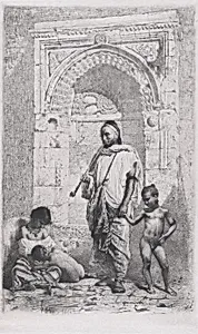 A Moroccan family in front of an arch, father standing, mother lower left on the ground holding a child