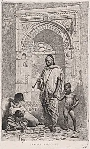 A Moroccan family in front of an arch, father standing, mother lower left on the ground holding a child