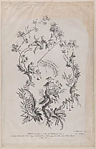 This etching presents fanciful chinoiserie ornament combining rococo asymmetry with imagined Chinese decorative motifs. The composition features exotic figures, undulating foliage, architectural elements, and fantastical creatures arranged in the flowing, asymmetrical manner characteristic of rococo design. Pillement's interpretation of Chinese art reflects European imagination rather than authentic observation, creating a hybrid decorative vocabulary that appealed to eighteenth-century taste fo...