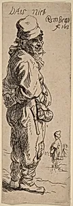 In 1634, during the Dutch Golden Age, Rembrandt van Rijn created *A Peasant Replying "Dats niet" (That's nothing)*, a lively etching that captures a moment of rustic humor. This small-scale print depicts a peasant gesturing emphatically while uttering the Dutch dialect phrase "Dats niet," suggesting a folksy dismissal or boast—perhaps brushing off a challenge with down-to-earth bravado. Rembrandt, then in his late twenties and building his reputation in Amsterdam, frequently explored everyday genre scenes like this, blending portraiture with narrative flair. As a master printmaker, Rembrandt revolutionized etching techniques, employing fine lines, burr from drypoint, and subtle inking variations to achieve dramatic chiaroscuro effects akin to his paintings. The medium's accessibility allowed wide distribution, making his innovative realism available beyond elite patrons. This work exemplifies his early experimentation with expressive faces and textured clothing, hallmarks of his Baroque style infused with psychological depth. Housed in the National Gallery of Art's Rosenwald Collection (Department CG-E), this etching highlights Rembrandt's prolific output of over 300 prints, which were prized for their technical brilliance and human warmth. It invites visitors to appreciate how 17th-century Dutch art elevated ordinary folk to timeless subjects, reflecting a cultural shift toward celebrating the commonplace amid prosperity.