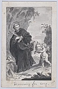 A saint holding a crucifix, an angel at right approaching with a papal tiara