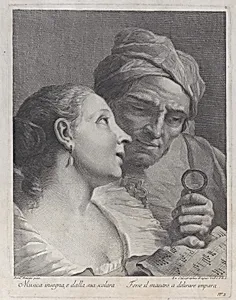 A schoolgirl and her music teacher looking at a sheet of music