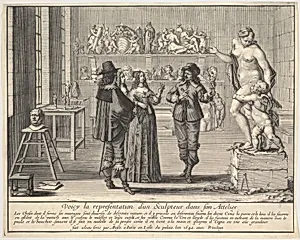 In 1642, French artist Abraham Bosse created *A Sculptor Presenting his of Venus and Cupid a delicate etching that captures a pivotal moment in the artist's workshop. Bosse, a master of medium and a key figure in 17th-century printmaking, produced this work during the Baroque era, when detailed reproductive prints like this one bridged painting, sculpture, and everyday life. Measuring about 10 by 13 inches, the trimmed sheet exemplifies etching's precision—acid biting into a metal plate to yield fine lines and textures that mimic sculpture's depth. The scene shows a sculptor proudly unveiling...