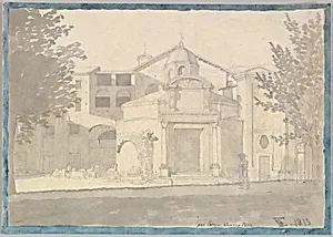 Christoffer Wilhelm Eckersberg a pioneering Danish artist often called the father of Denmark's Golden Age of Painting, captured this precise architectural study during his formative travels in Rome around 1814–15. Titled *A Section of the Via Sacra Rome (The Church of Cosmas and Damian)* the drawing depicts a segment of the ancient Sacred Way in the Roman Forum, leading toward the historic 6th-century church built by Pope Felix IV on the ruins of pagan temples. Eckersberg's keen eye for light and structure transforms this everyday Roman vista into a timeless record of classical antiquity blend...
