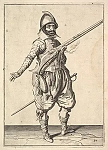 A soldier on guard freeing his right hand, from the Marksmen series, plate 37, in Wapenhandelinghe van Roers Musquetten Ende Spiessen (The Exercise of Arms)