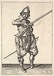 A soldier on guard shaping the match between his thumb and his forefinger, from the Marksmen series, plate 41, in Wapenhandelinghe van Roers Musquetten Ende Spiessen (The Exercise of Arms)